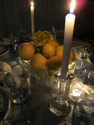 Your table setting is gorgeous! I like how you showed it at night in a romantic setting. I had not seen that done before. My favorite was how the bright yellow lemons set off your blues. I am glad I stopped by today.